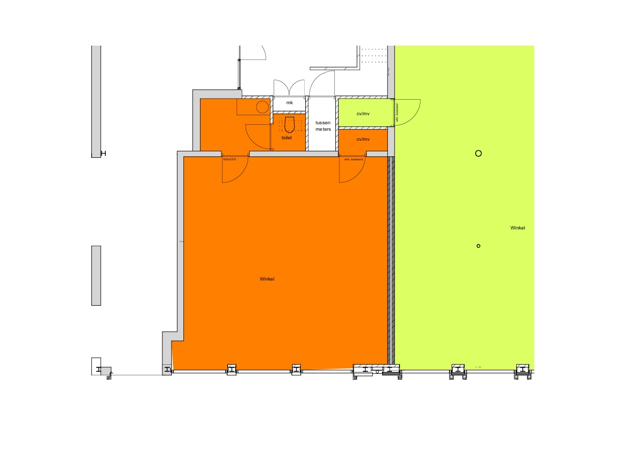 De winkelruimte is nagenoeg vierkant. Achterin de winkel zijn nog een privéruimte met keuken en toilet en berging gecreëerd. De Frontbreedte is circa 8 meter.