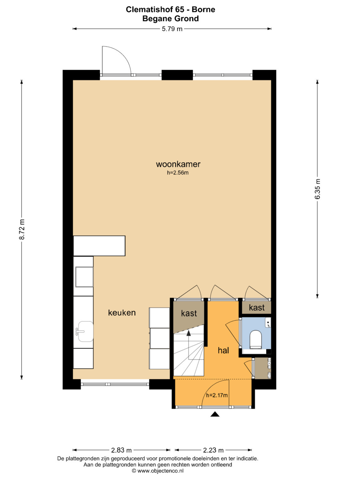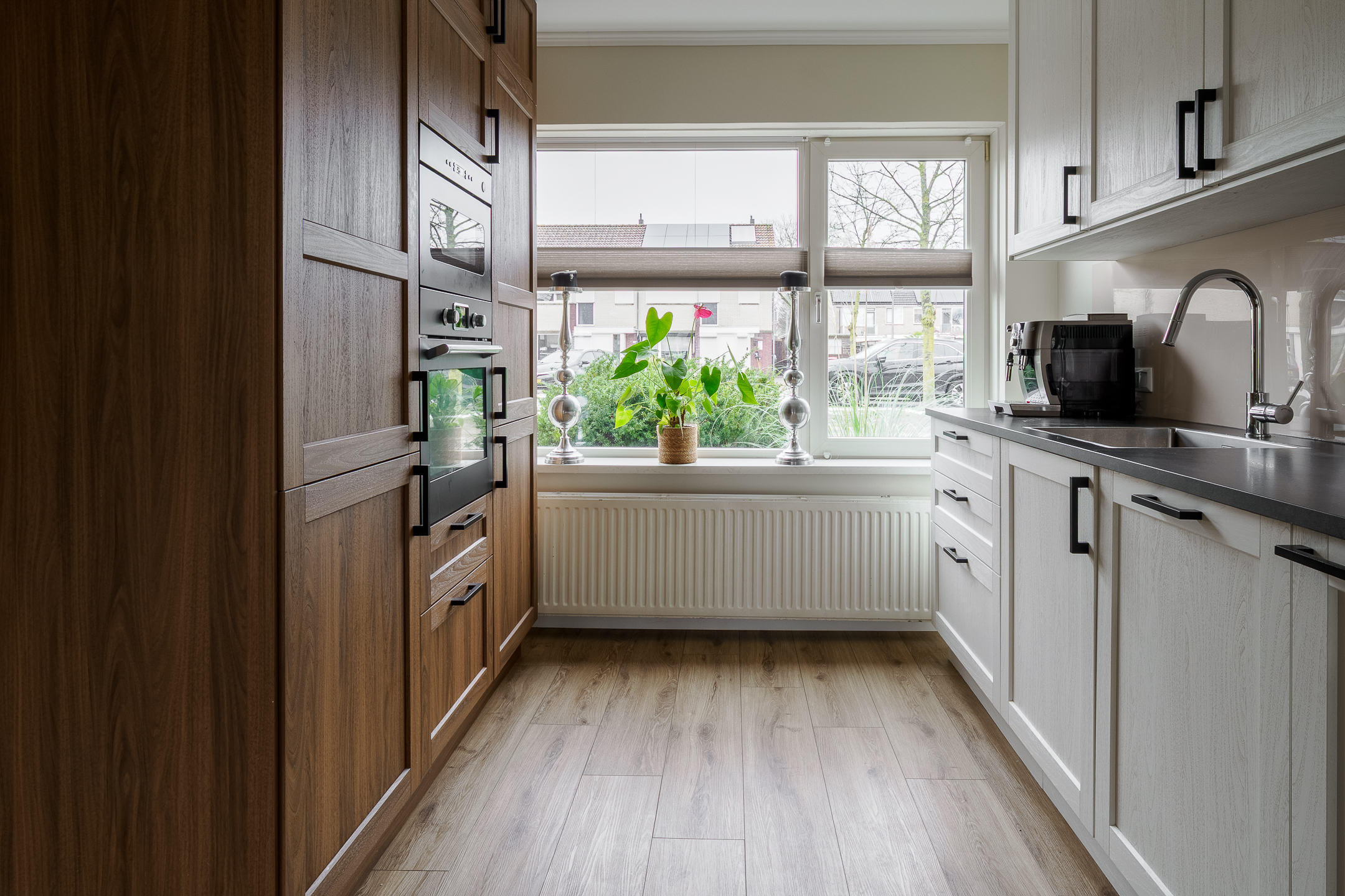Begane grond: Entree, hal, vernieuwde meterkast, toilet met fontein, zeer ruime woonkamer met PVC-vloer en vaste kasten, moderne halfopen keuken (2024) met inbouw inductiekookplaat, vaatwasser, afzuigkap, koelkast, vriezer en oven en magnetron. Verder is er een trapkast voor praktische extra bergruimte.
