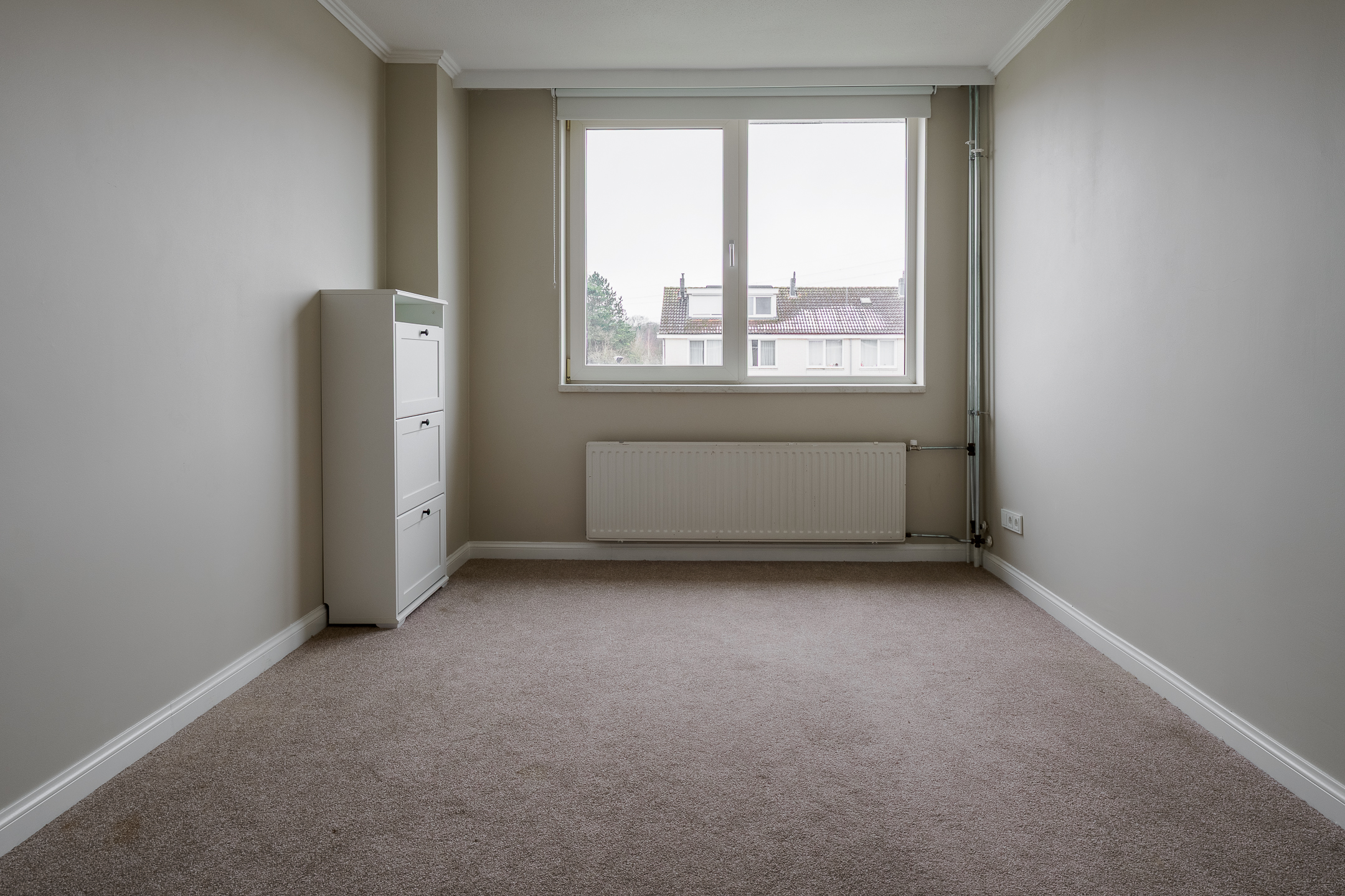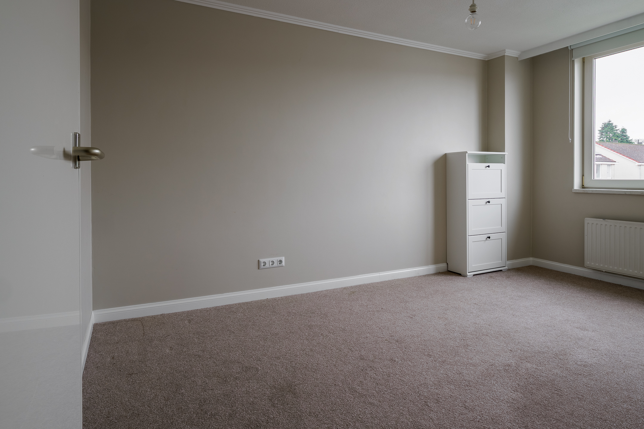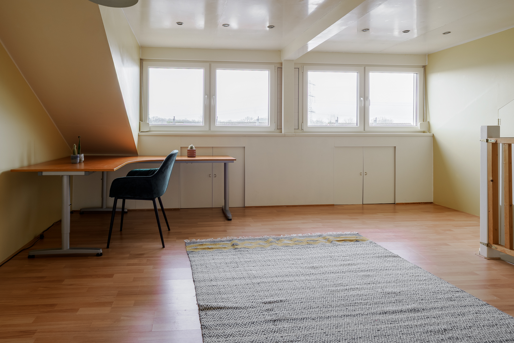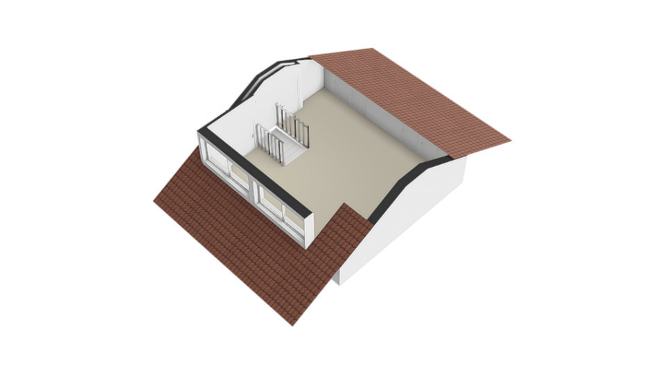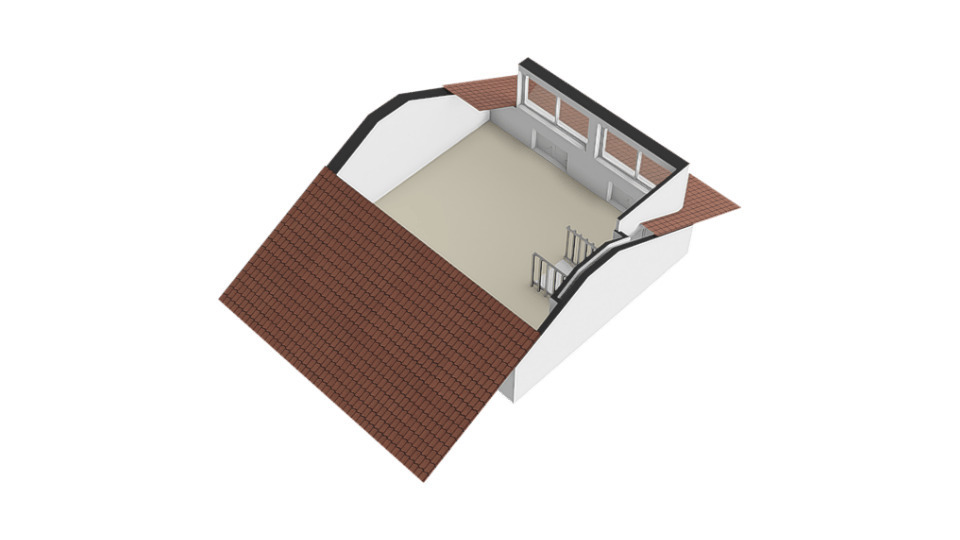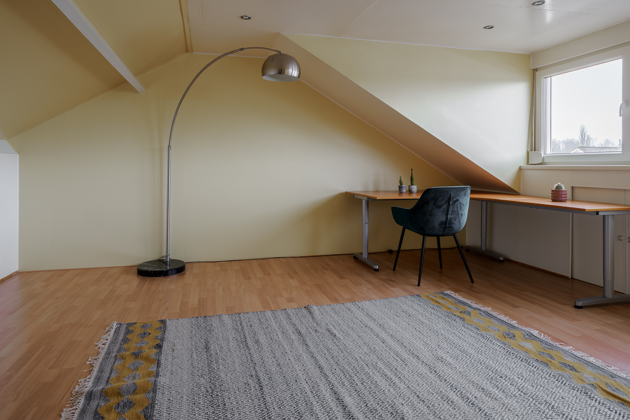 Tweede verdieping: grote slaapkamer met dakkapel en rolluik. Achter de knieschotten bevindt zich extra opbergruimte.