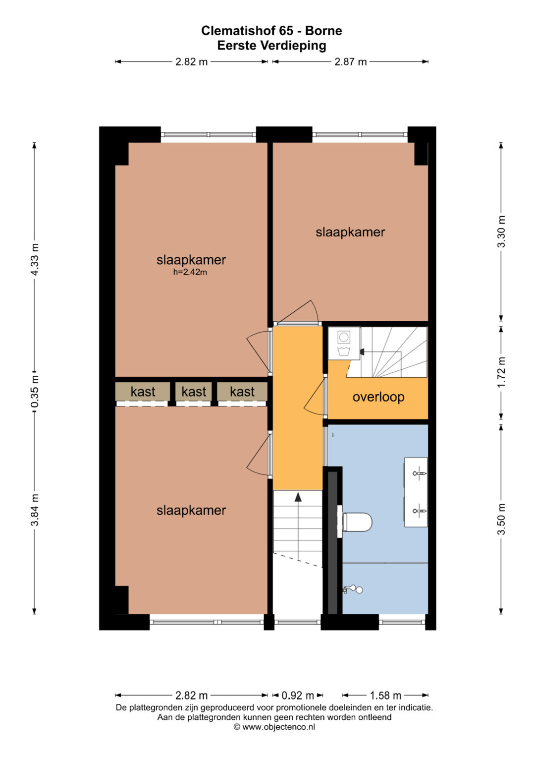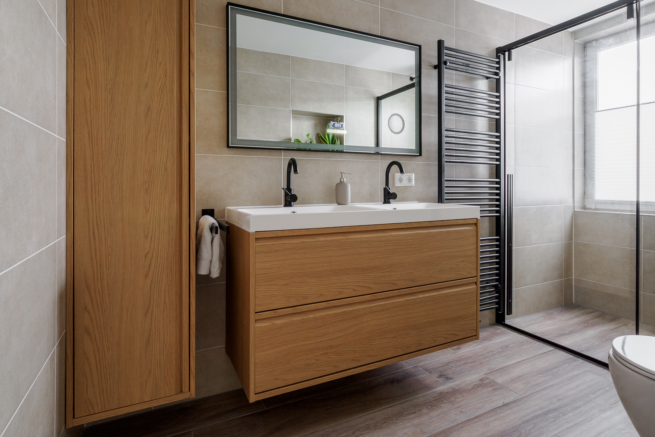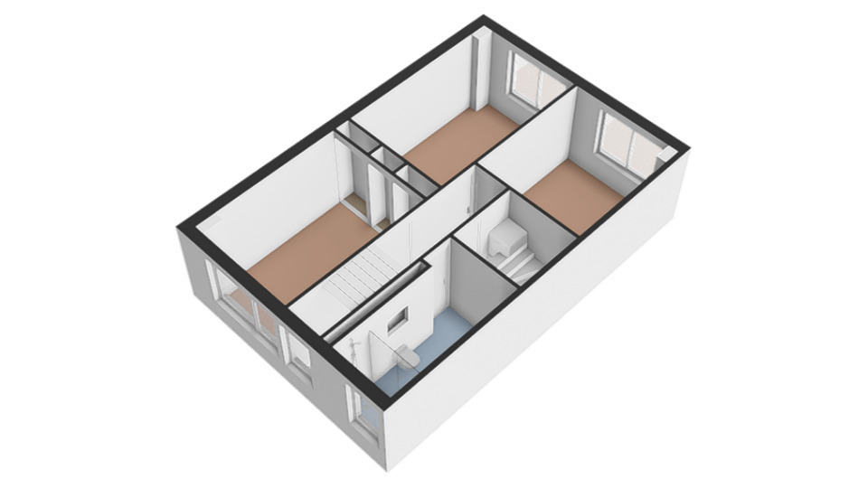 Eerste verdieping: overloop, 3 slaapkamers en een badkamer met grote inloopdouche, dubbele wastafel met ombouw en een toilet. Vaste trap naar ......