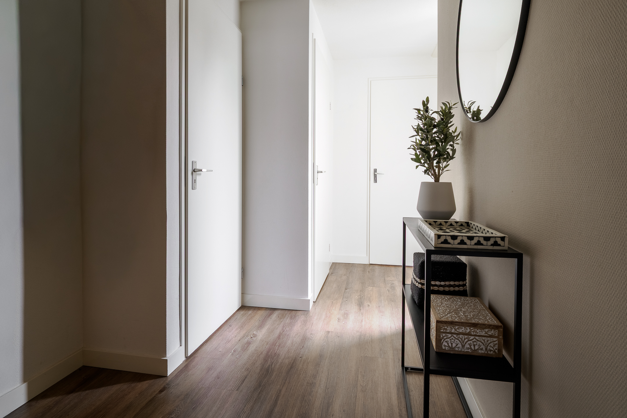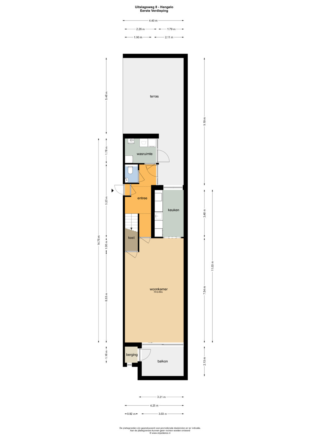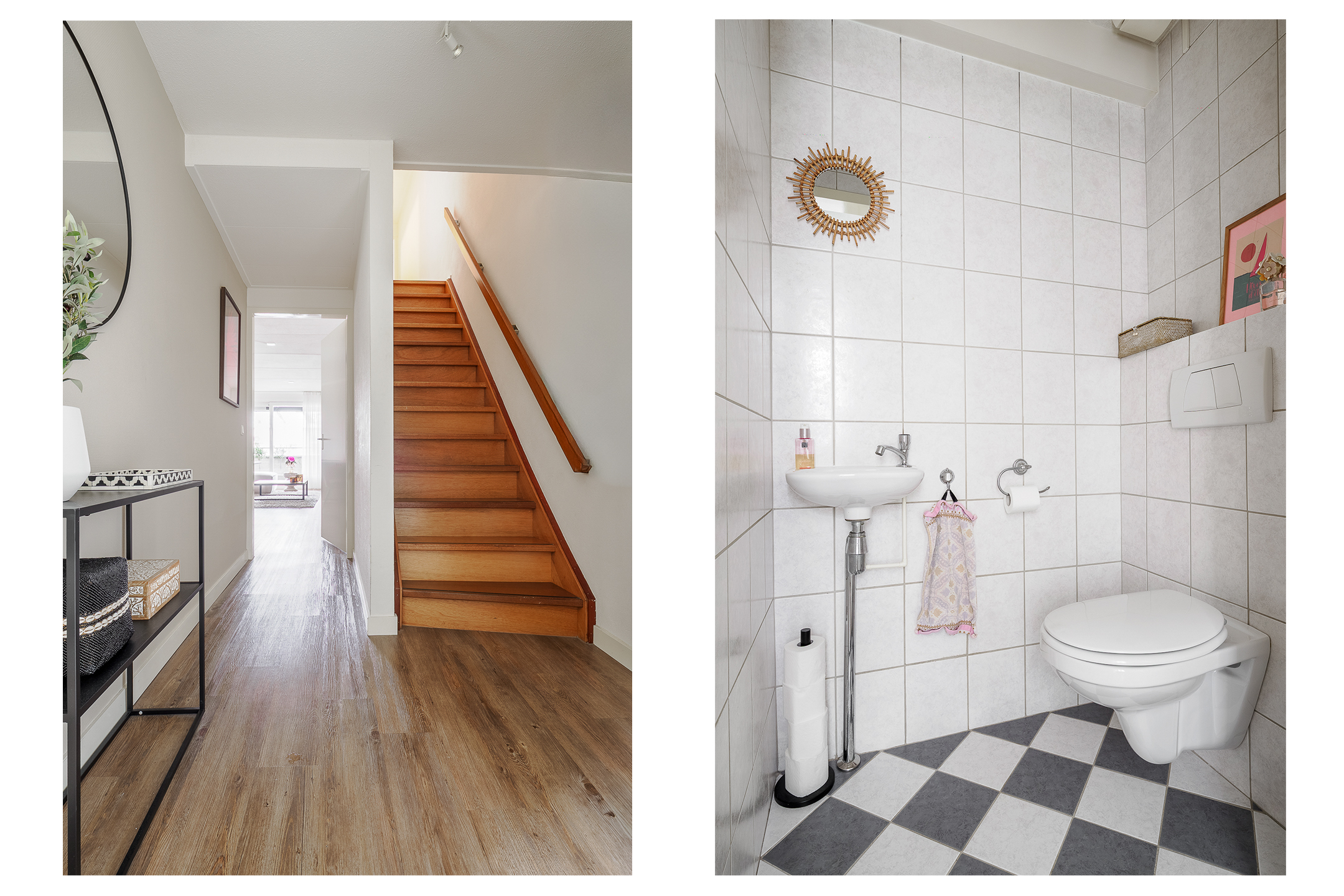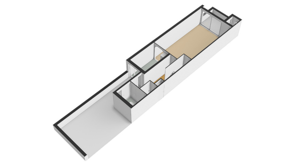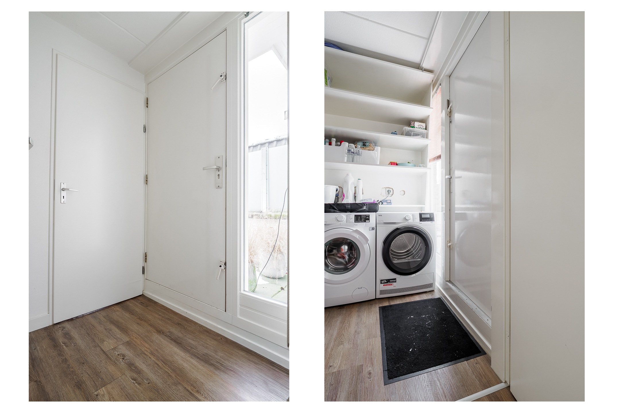 Natuurlijk is er een entree op de begande grond. Via die entree kom je bij de brede betonnen trap naar de eerste verdieping. Op de eerste verdieping loop je langs het terras van de buren naar het geheel afgesloten dakterras van jouw nieuwe woning. Er zijn hier twee deuren die toegang geven aan de woning. De één via de bijkeuken c.q. berging en de ander direct in de hal. In de hal vind je het toilet en de meterkast. De bijkeuken biedt je ruimte voor je wasmachine en droger. Tevens vind je hier de CV opstelling.