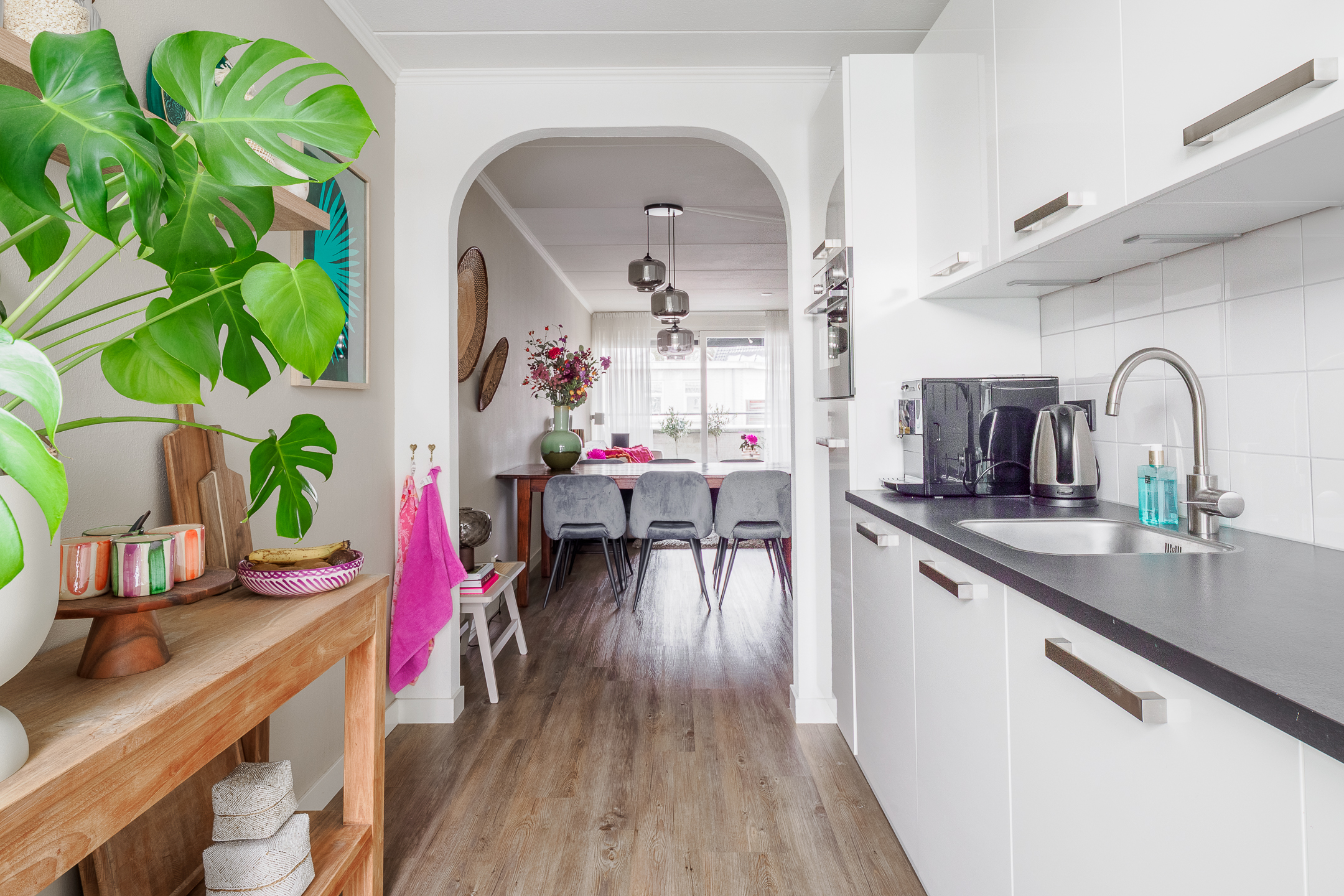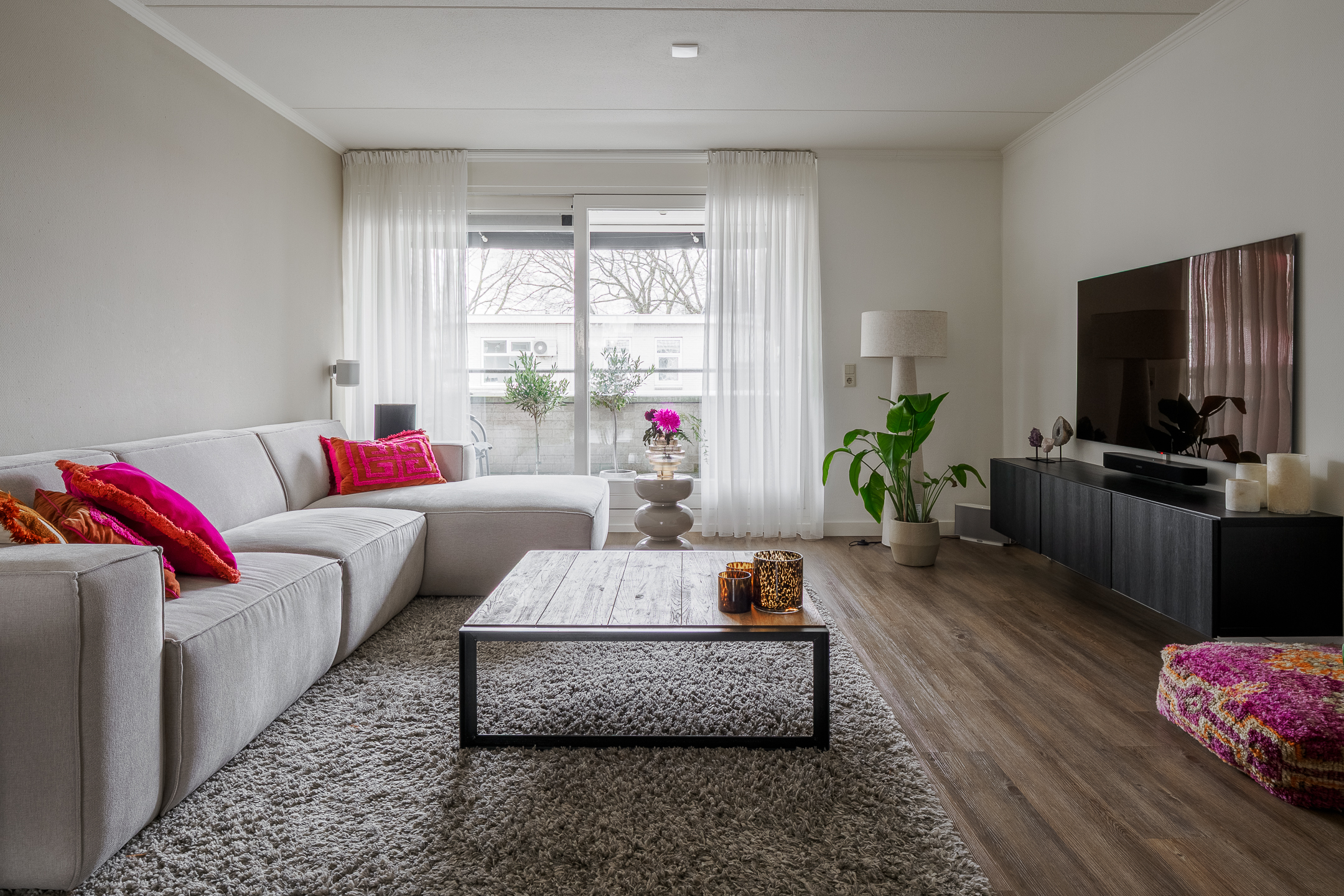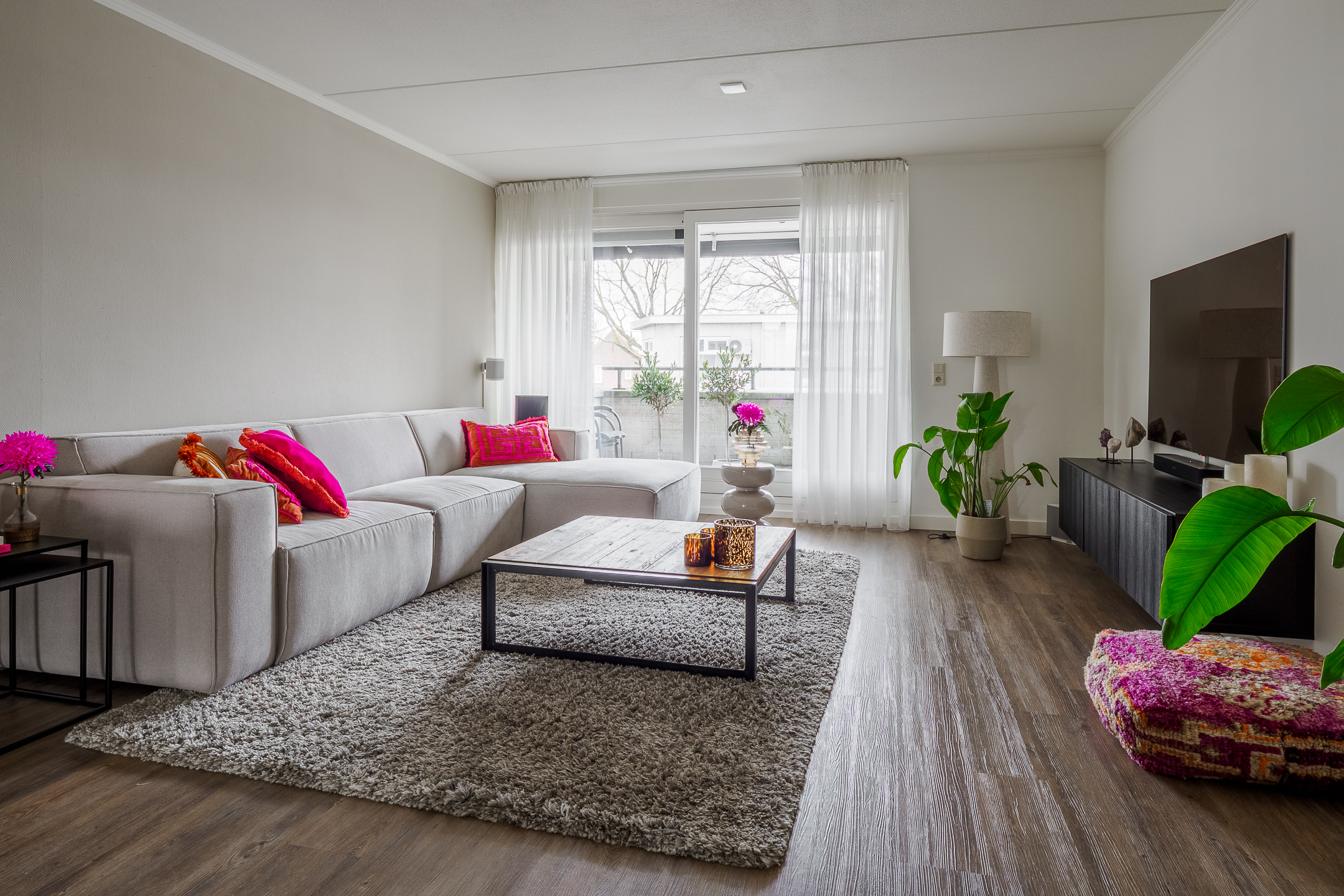 De woonkamer is lekker ruim en voorzien van een PVC-vloer, die voorzien van vloerverwarming. Lekker warme voetjes dus. Aan de voorzijde van de woning is een ruim en overdekt balkon met uitzicht op de Uitslagsweg en handige vaste buitenkast. De keuken ligt aan de achterzijde van de woning. De moderne witte keuken is open en voorzien van een inductiekookplaat, vaatwasser, afzuigkap, combi-magnetron en een koelkast.