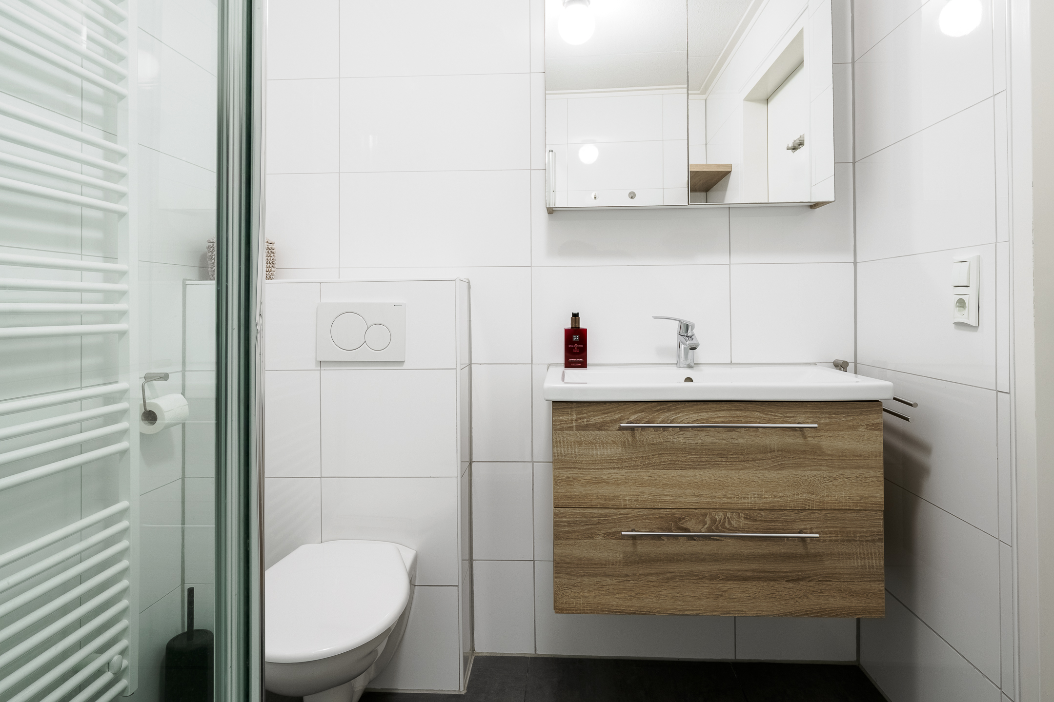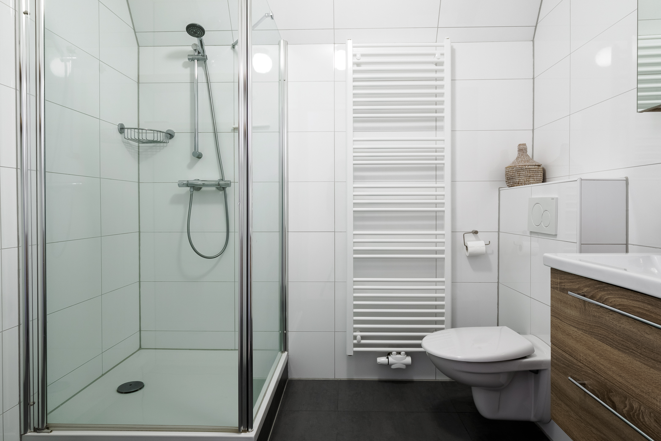 Overloop, twee slaapkamers, badkamer met douche, toilet en wastafel.